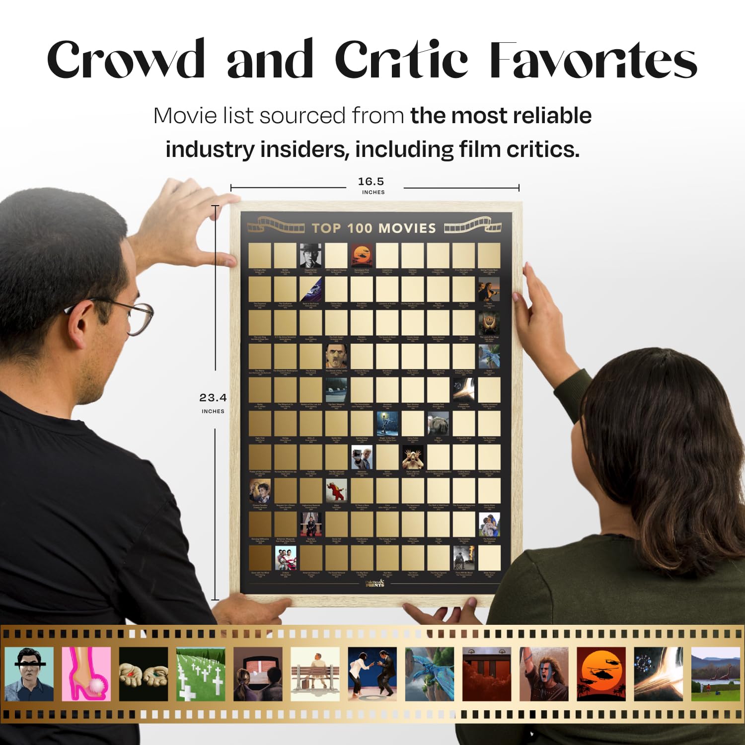 We collected all crowd and critic data from top industry sources such as Rotten Tomatoes, IMDB, The National Society of Film Critics, The Oscars, and more to curate each movie list. Basically, if the whole world agrees it's a great movie, it makes the poster