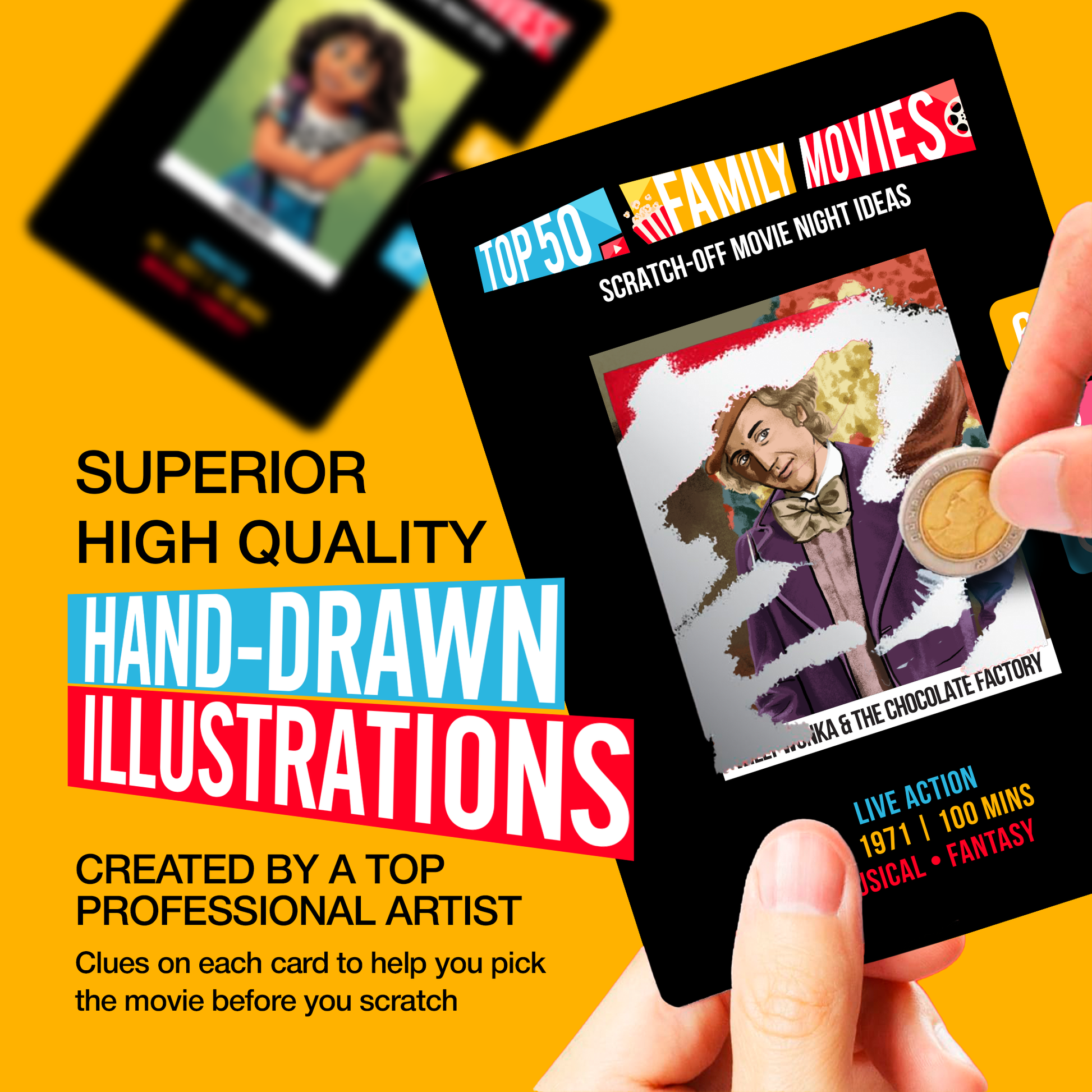 The movie lover gift to cure movie night indecision — scratch, reveal, and watch 50 of the top-rated films of all time. Read year, rating, and genre clues at the bottom of each card, decide the vibe, and scratch one off to reveal a beautiful hand-drawn illustration of the movie you'll be watching. No more endless scrolling, no more debating. All movies are readily available on Prime Video. Perfect for movie lovers, date nights, family gatherings, or as unique gifts.