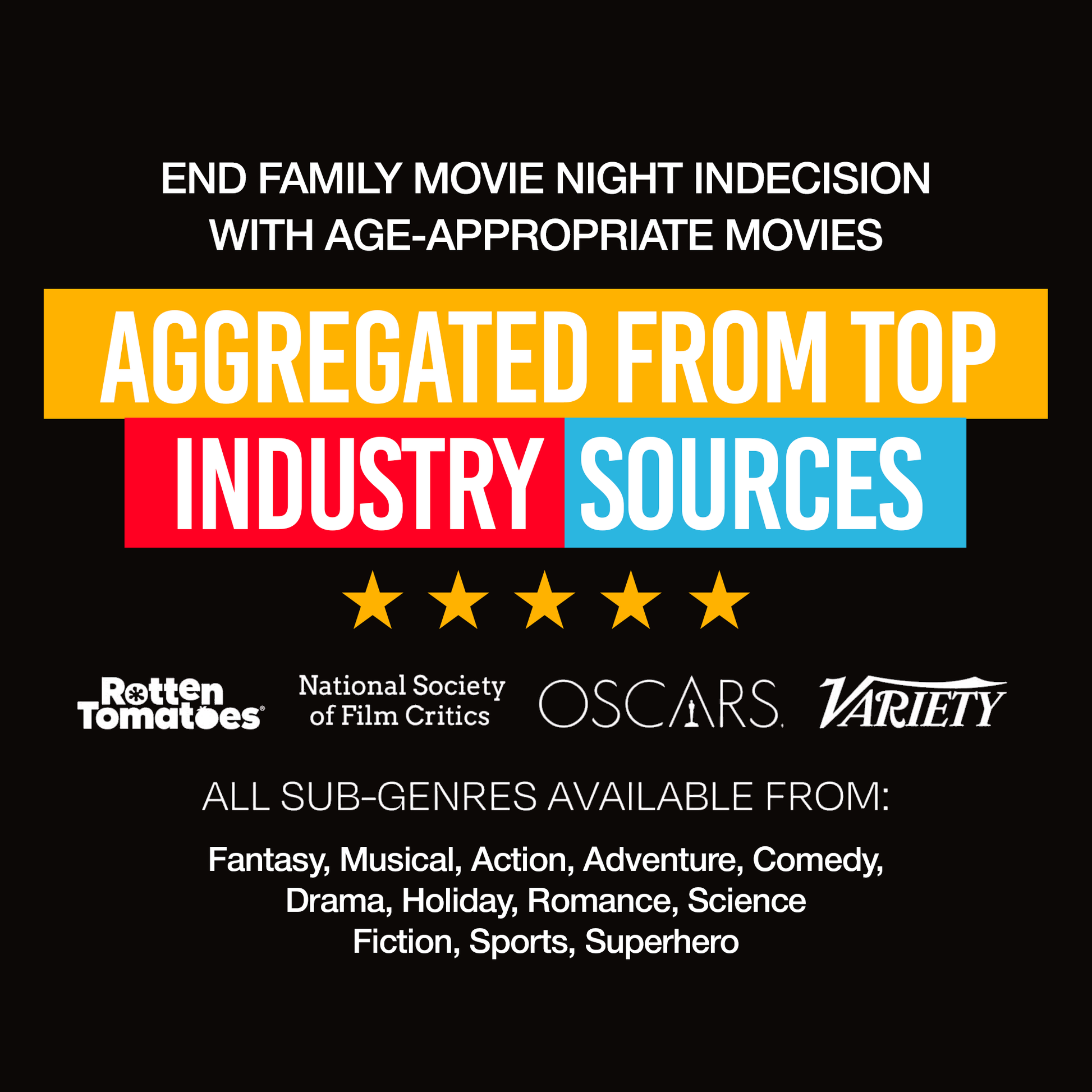 We collected all crowd and critic data from top industry sources such as Rotten Tomatoes, IMDB, The National Society of Film Critics, The Oscars, and more to curate each movie list. Basically if the whole world agrees it's a great movie, it makes the deck.