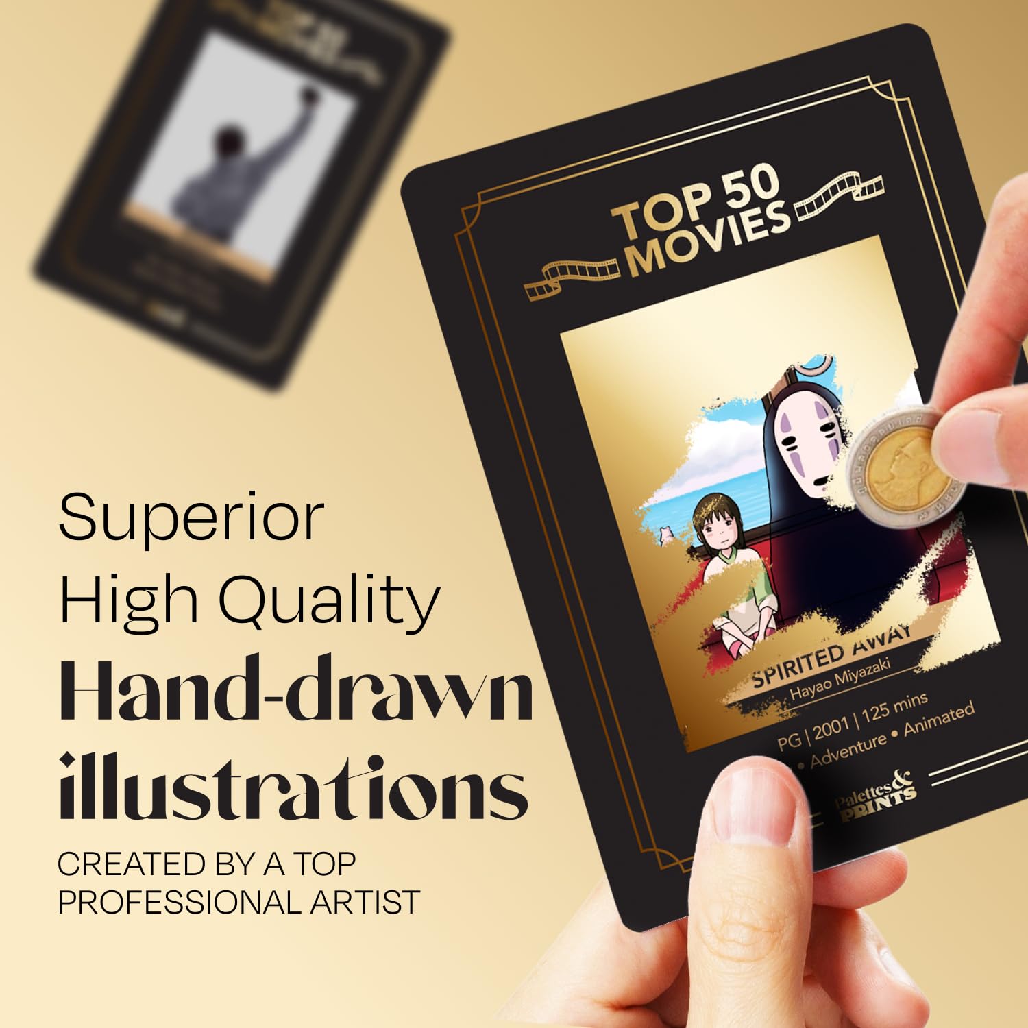 The movie lover gift to cure movie night indecision — scratch, reveal, and watch 50 of the top-rated films of all time. Read year, rating, and genre clues at the bottom of each card, decide the vibe, and scratch one off to reveal a beautiful hand-drawn illustration of the movie you'll be watching. No more endless scrolling, no more debating. All movies are readily available on Prime Video. Perfect for movie lovers, date nights, family gatherings, or as unique gifts.